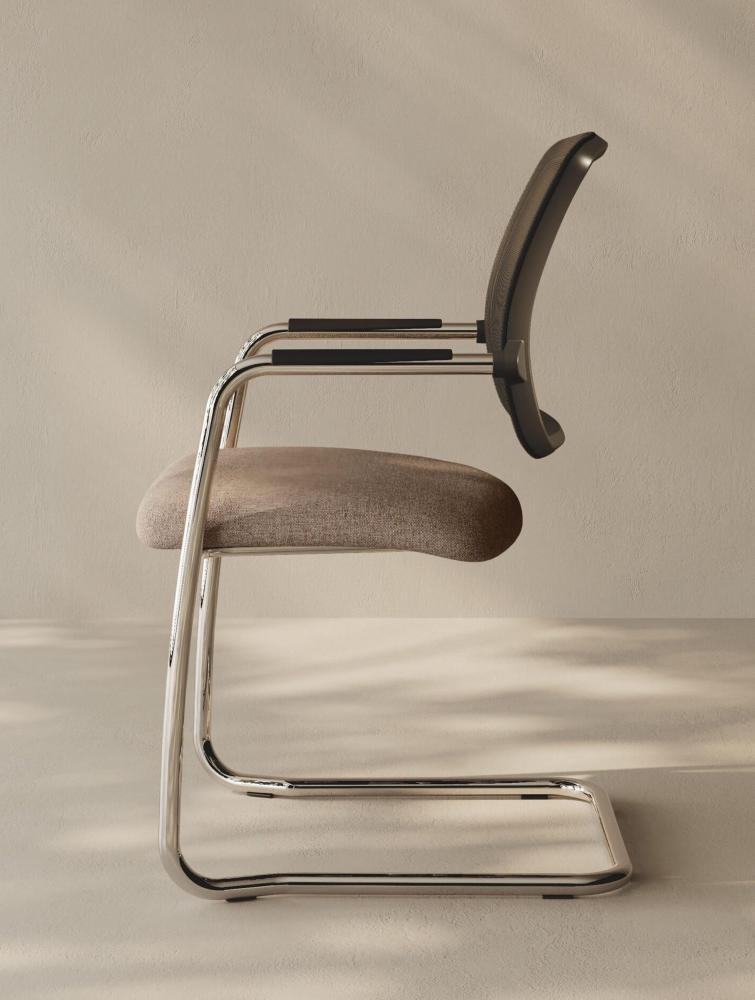 POLTRONA VISITATORE SERIE COMFORT SU SLITTA IN METALLO TUBOLARE CROMATO, SCHIENALE IN RETE NERA, BRACCIOLI IN POLIPROPILENE NERO E PIEDINI IN PLASTICA (TESSUTO CAT.F)